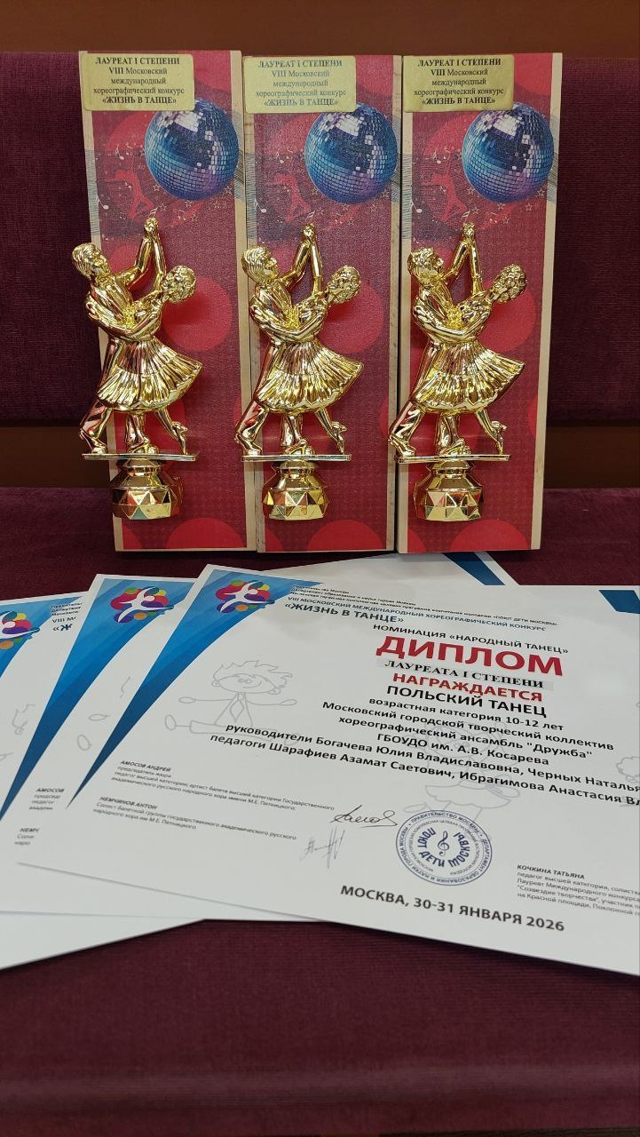 31 января 2026 года танцоры Московского городского хореографического коллектива ансамбль «Дружба» приняли участи в VII Московском международном хореографическом конкурсе «Жизнь в танце» представив номера: башкирский танец «Семь девушек», «Крестьянский бранль» и «Польский танец». Все три номера получили высокую оценку — лауреат I степени! Поздравляем наших юных танцоров с заслуженной наградой!